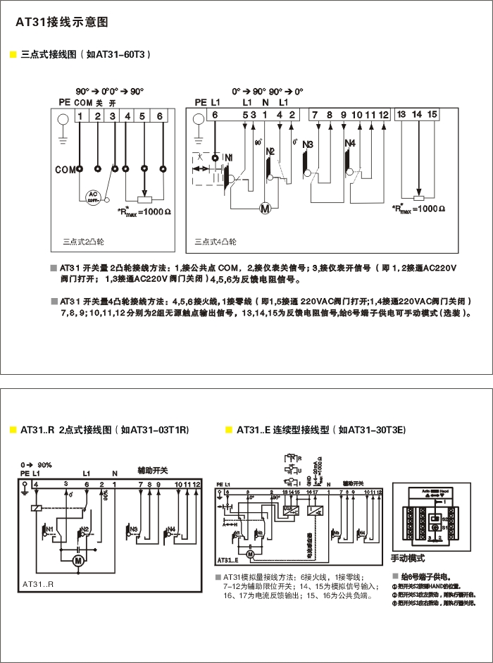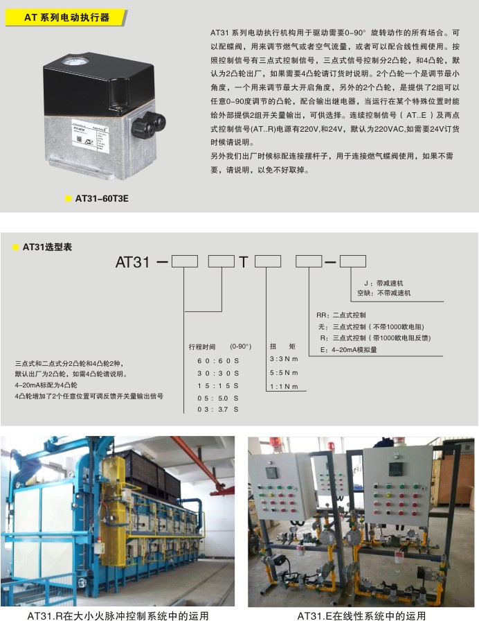 AT31 系列电动执行机构用于驱动需要0-90°旋转动作的所有场合。可以配蝶阀,用来调节燃气或者空气流量,或者可以配合线性阀使用。按照控制信号有三点式控制信号,三点式信号控制分2凸轮,和4凸轮,默认为2凸轮出厂,如果需要4凸轮请订货时说明。2个凸轮一个是调节最小角度,一个用来调节最大开启角度,另外的2个凸轮,是提供了2组可以任意0-90度调节的凸轮,配合输出继电器,当运行在某个特殊位置时能给外部提供2组开个量输出,可供选择。连续控制信号( AT..E )及两点式控制信号(AT..R)电源有220V和24v